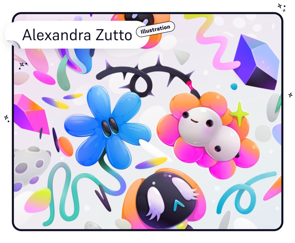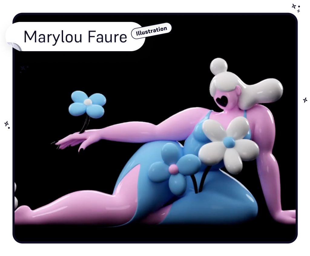 Les utilisateur·rices d’After Effects connaissent déjà cette artiste sans le savoir, puisque c’est elle qui a réalisé l’illustration de couverture actuelle du logiciel. Pour les autres, voici Alexandra Zutto ! On adore ses illustrations bubblies et rebondies. Son travail autour de la matière, de la lumière et des reflets est vraiment remarquable, et ça donne envie de faire squish squish avec tous ces petits objets.