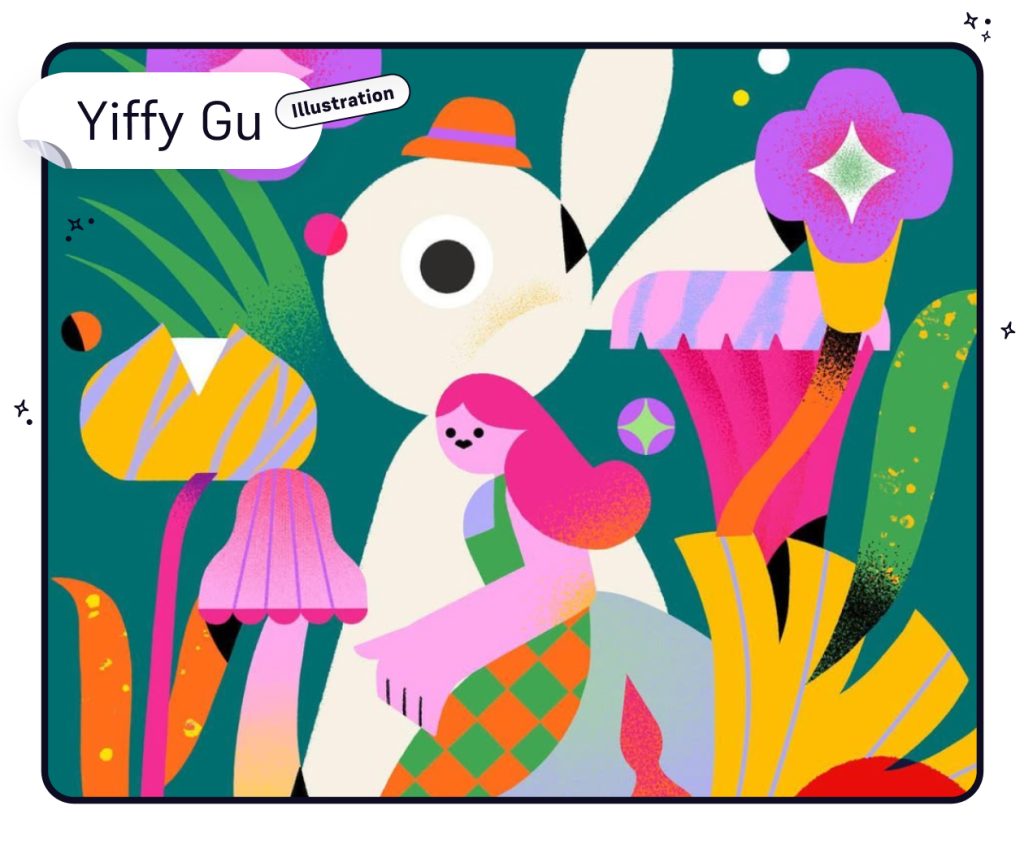 Texture toujours, mais avec beaucoup plus de couleurs et de mignonnerie. Le travail d’Yiffy Gu explose la rétine et ne peut que mettre de bonne humeur. Ses illustrations vibrantes et saturées jouent avec les matières, les couleurs et les formes de manière hyper audacieuse et ludique : c’est superbe.