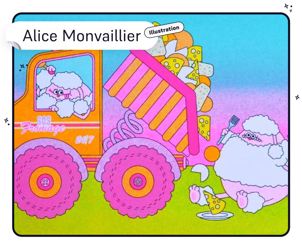 Vous voulez encore un peu plus de couleurs ? Vous n’en avez pas eu assez ? Ça tombe bien, le travail d’Alice Monvaillier est là pour ça. Absurde, pop, mignon, subversif et tout doux en même temps : les illustrations de cette artiste sont aussi vivantes que drôles. Mention très spéciale pour le badge Petite Bouloche de nombril, qui a achevé de faire fondre mon cœur. On ne peut que vous conseiller d’admirer son travail en cas de cafard.